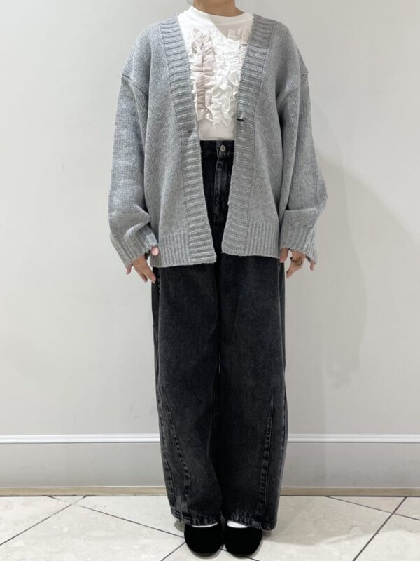 カーディガンの色味がシンプルなので、ラブリーなトップスを着ていただいても可愛く着て頂けます。
