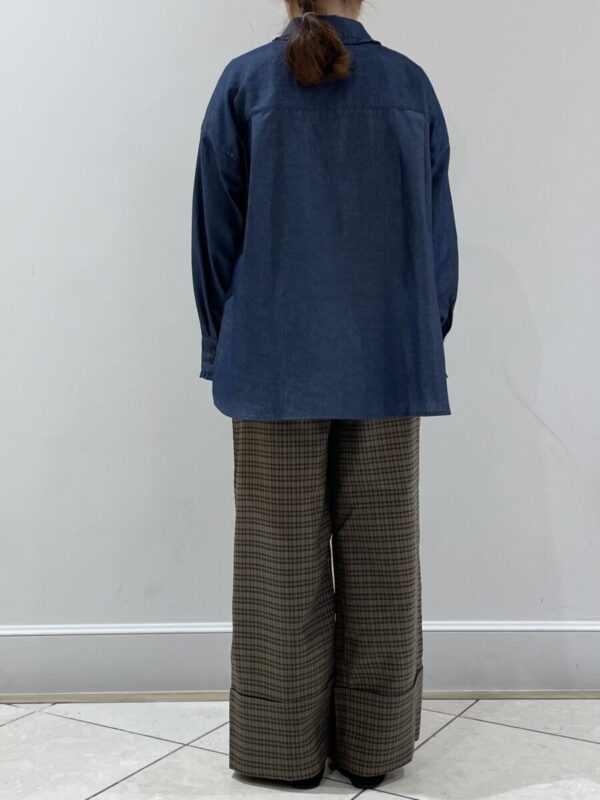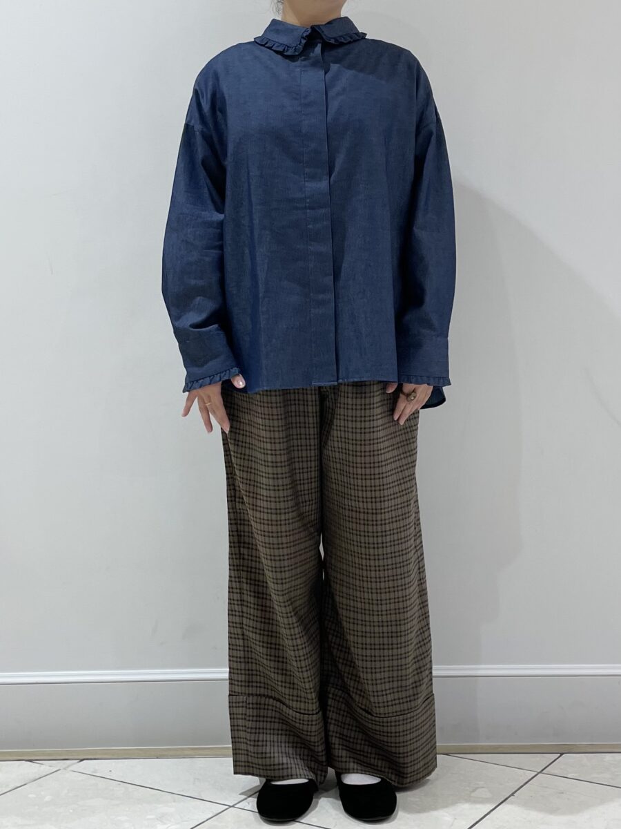 襟のフリルがアクセントになるカジュアルガーリーコーデです。