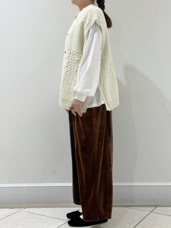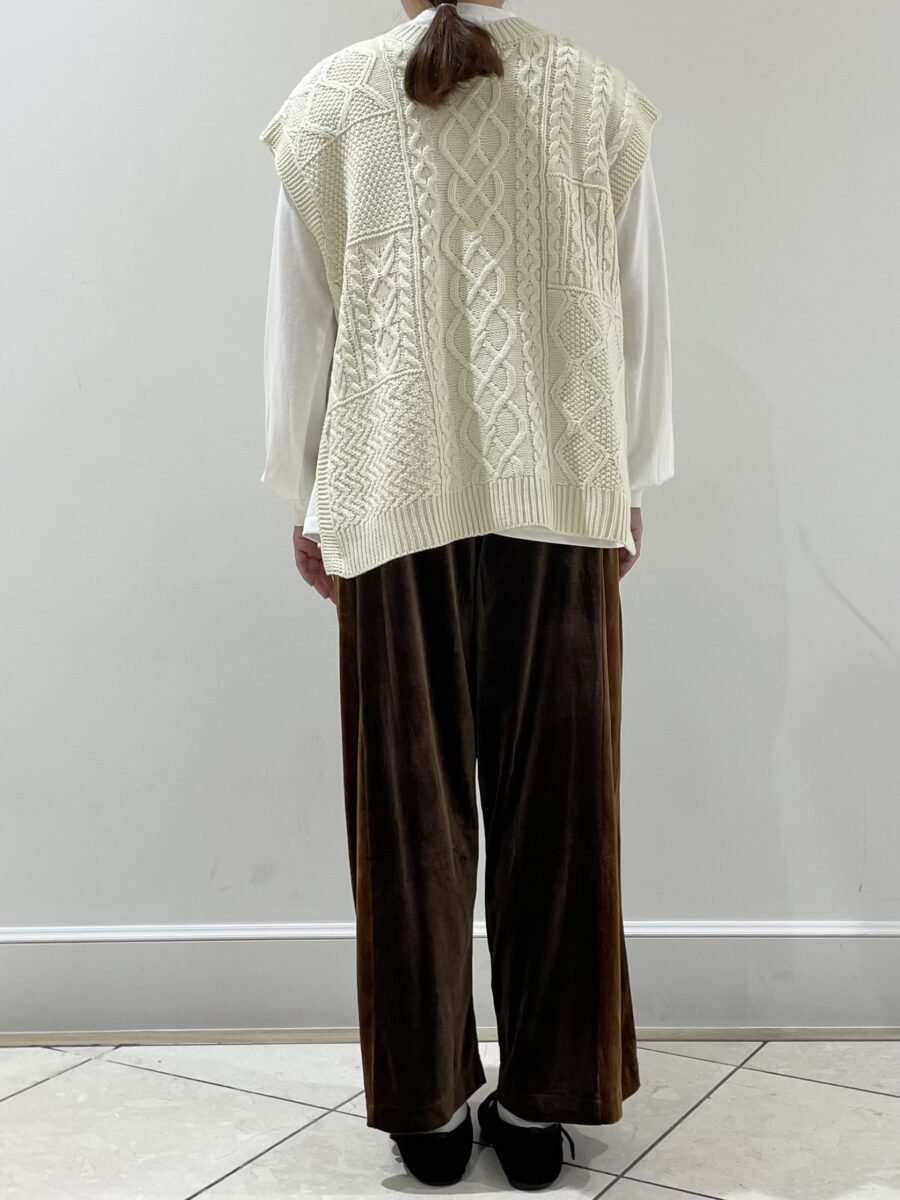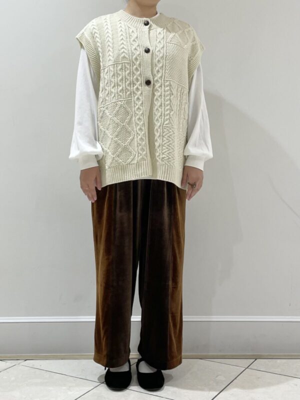 ニットベストとベロアパンツでカジュアルに合わせてみました。