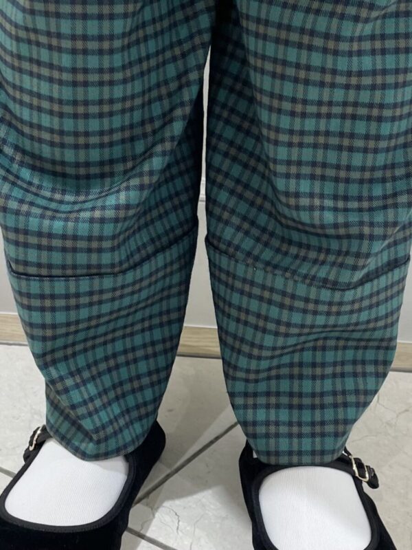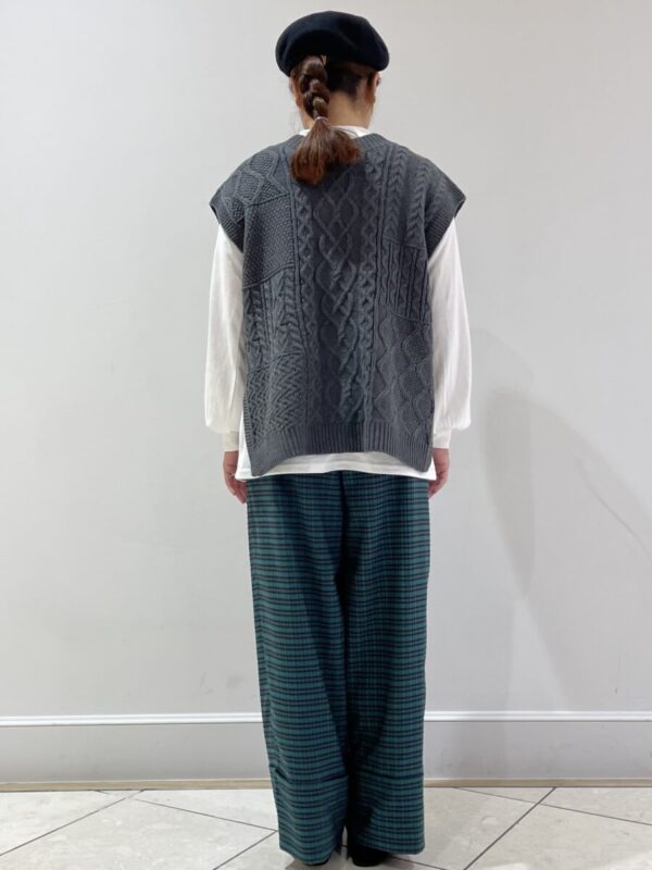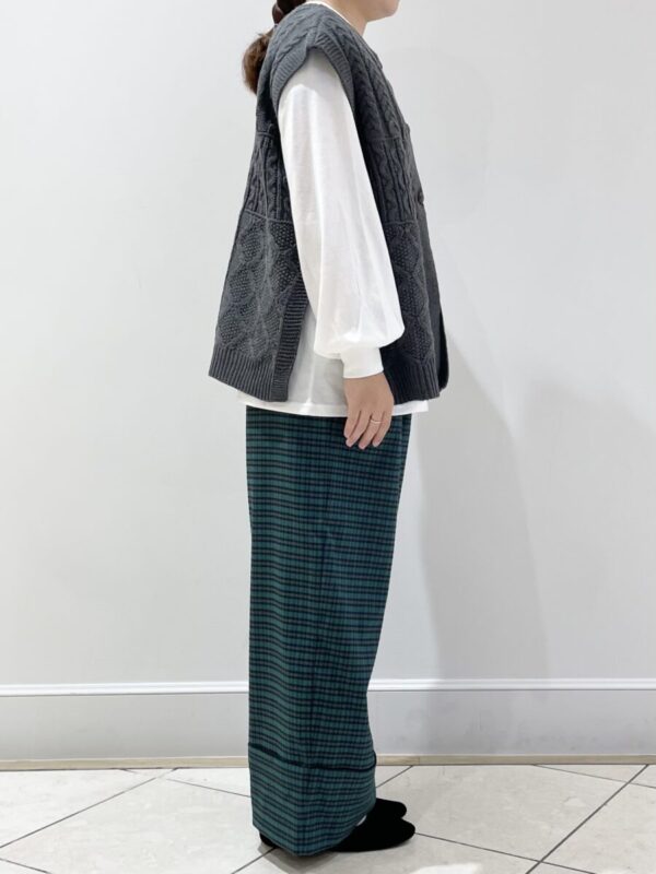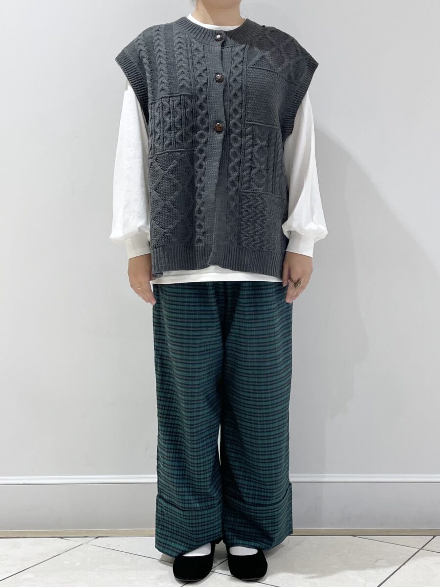 こちらは同じニットベストとチェックパンツのガーリーコーデです!